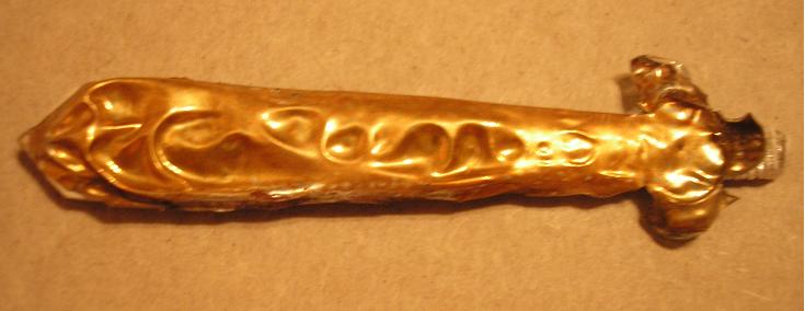 Мне все-таки не давала покоя пленка, которая при нагревании "обтягивает" предмет. Я понимала, что такой фольги у меня нет. Но у меня же есть конфетные фантики из мягкой фольги! Может, подойдут? УзнАю только если проверю. Для рыцарских доспехов нужен меч. Я склеила такой вот непростой картонный: